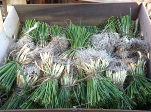 Onion harvest should occur in May and June or when the onions have matured to the desired size. Pull the onions, leave laying in the row for 1-3 days for drying, clip the tops and roots and store in a cool dry place until needed.